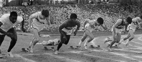 ![]() The start of the 100 yard dash in a 1968 meet vs. Washington U (St. Louis) at SEMO - From left, Vern Wellington running unattached (wearing a white shirt), Walter Smallwood, Lester Williams. |