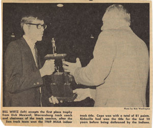 ![]() Central Missouri State Coach Richard Maxwell presents the 1969 MIAA Indoor Track championship trophy to Bill Wirtz as Tim Rademaker, Larry Briggs, Mike Ervin and Bruce Frankie wait to celebrate. |