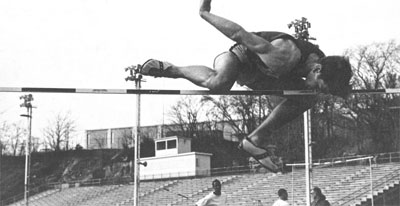 SEMO high jumper Larry Hollrah about to land in a pit of sawdust in 1965. |