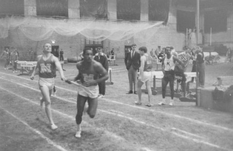 Bruce Frankie hands off to Clarence Finley in the Mile Relay at the Indoor Conference in 1968.