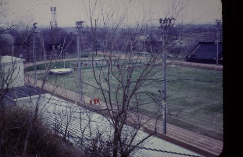 A photo of Houck Stadium prior to the SEMO dual meet vs. Evansville in 1968 - a very cold day for a track meet.
