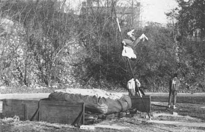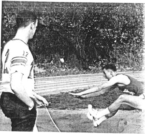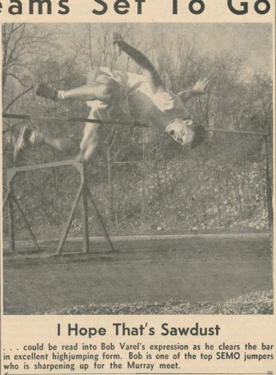 SEMO high jumper Larry Hollrah about to land in a pit of sawdust in 1965. |