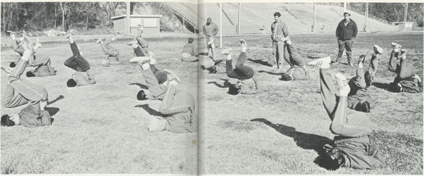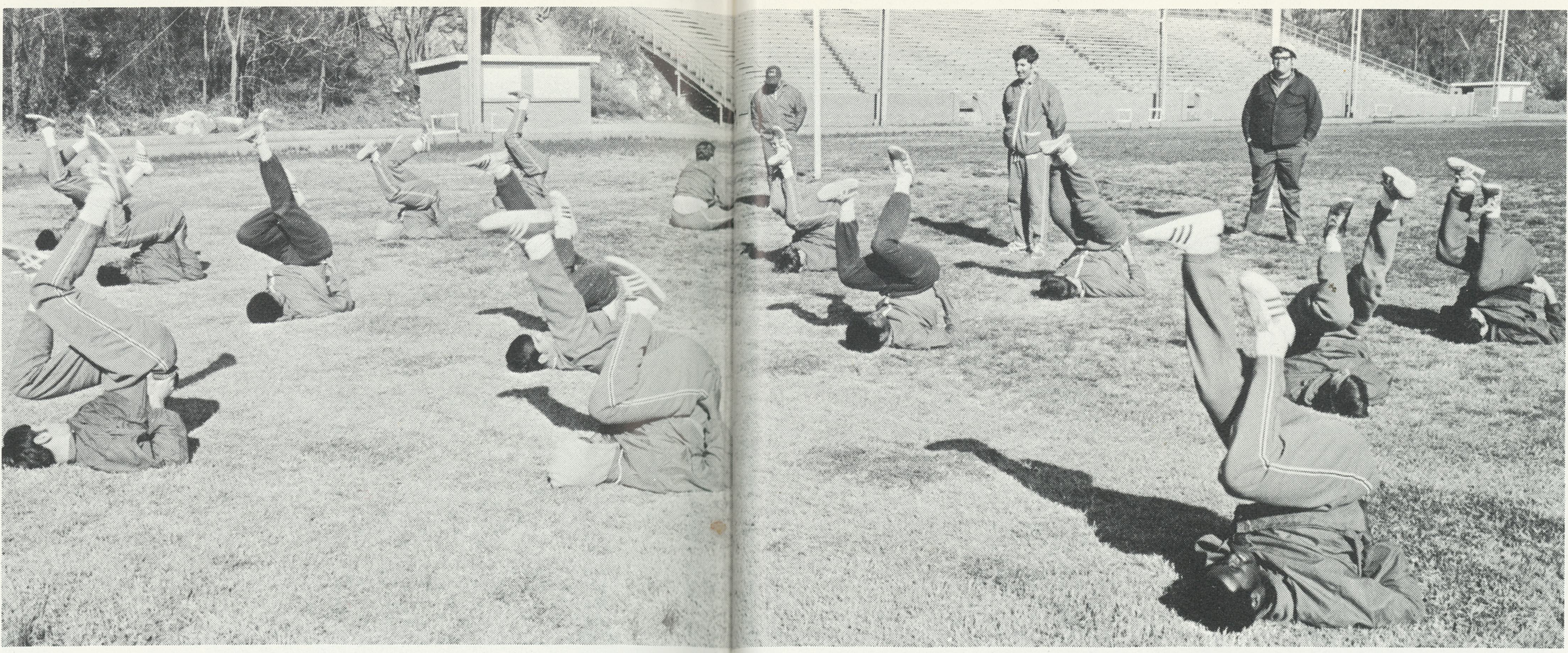 The 1971 team is shown doing the bicycle exercise. Coach Marvin Rosengarten, GA Marty Corcoran & team manager Terry Corbin are pictured on their feet. |