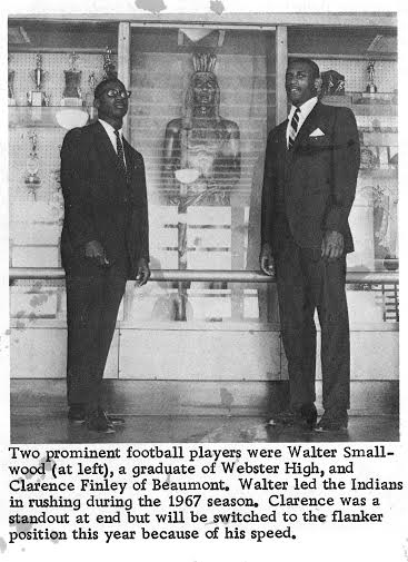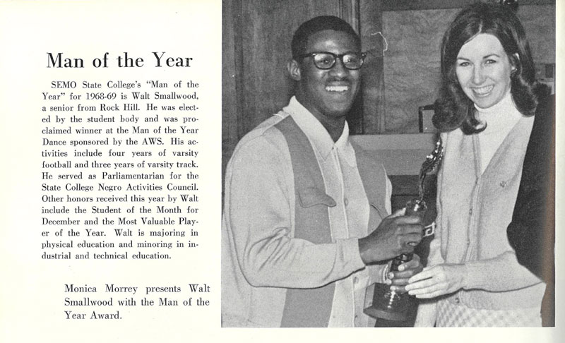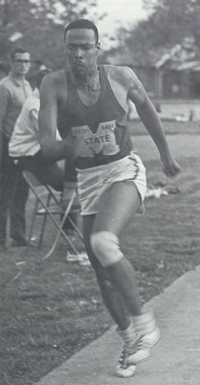 ![]() The start of the 100 yard dash in a 1968 meet vs. Washington U (St. Louis) at SEMO - From left, Vern Wellington running unattached (wearing a white shirt), Walter Smallwood, Lester Williams. |