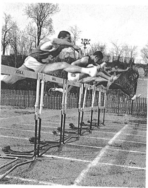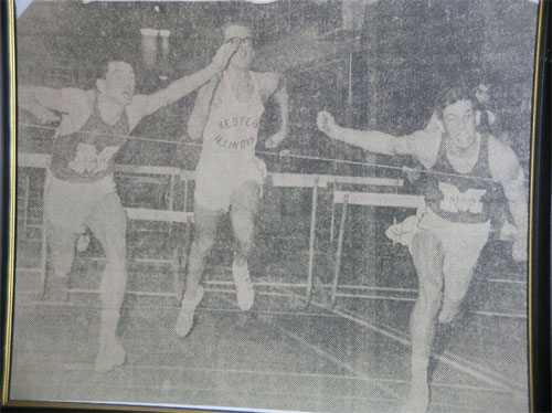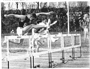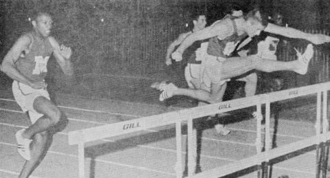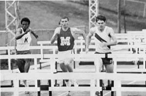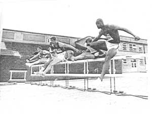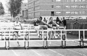 ![]() Clark Wille is pictured temporarily leading Thomas Hill (far right) of Arkansas State in 1968. Hill went on to a great college track career and was the bronze medalist at the 1972 Munich Olympic games in the 110m HH. Also pictured are Paul Hubbard and Dave Lehmann. |
