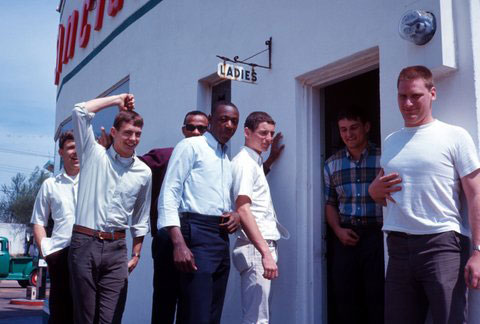 Photo probably taken in Van Buren, MO at a gas/restroom stop on the way to the Springfield Relays - 1967.